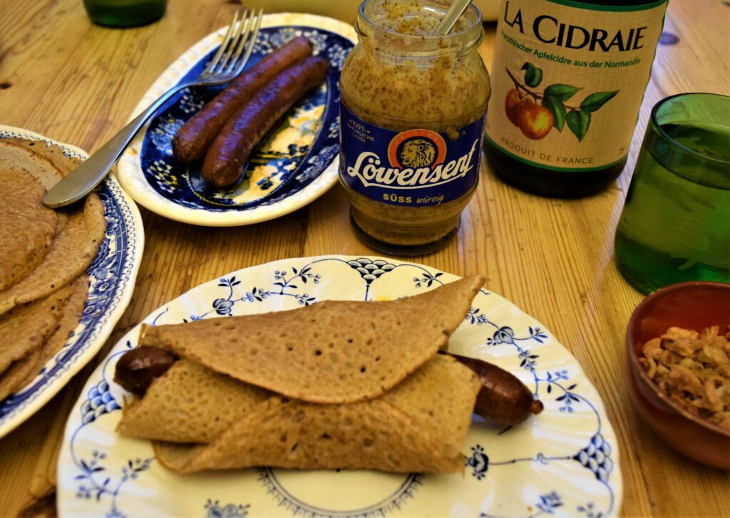 Die originale Galette wird übrigens in der Regel nicht unbedingt mit einem eingerollten Würstchen serviert, sondern beispielsweise mit einem Ei, geriebenem Emmentaler, Schinken, Tomaten, Rost Beef, gedünsteter Spinat, Humus oder Thunfischcreme. Wir haben uns für das hier vorgestellte Rezept für eine Variante mit Marguez entschieden, einer scharf gewürzten, gegrillten Lammwurst aus Nordafrika. Als Getränk sollte ein herber Cidre nicht fehlen!