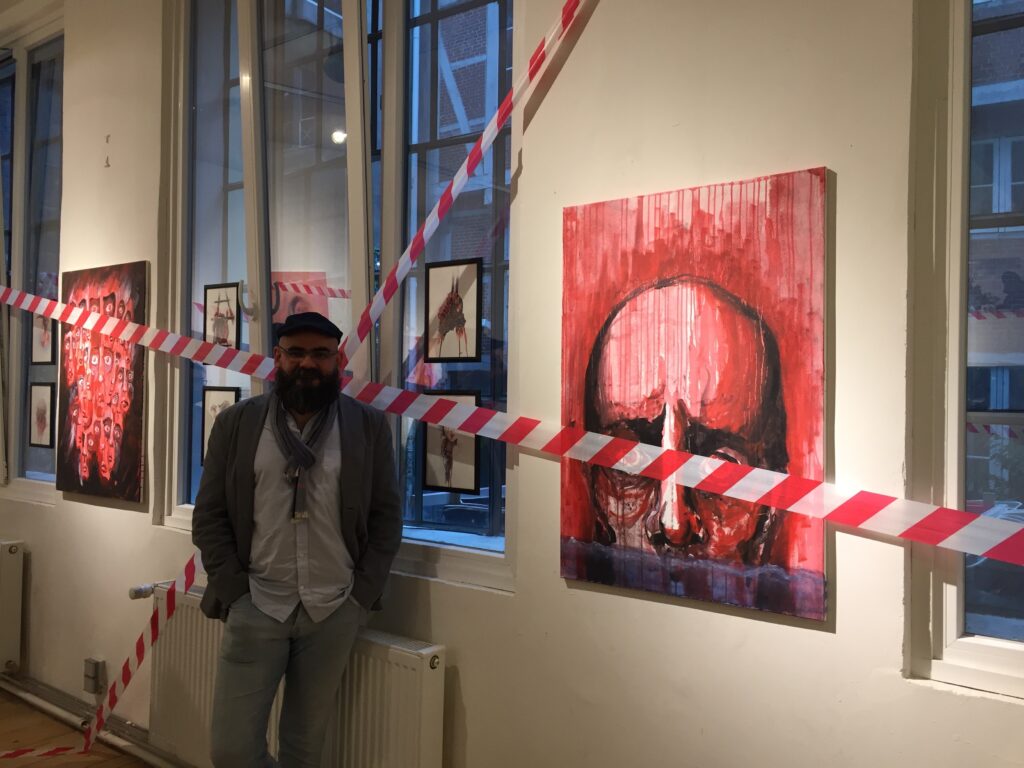 Leider bin ich in einer großen Gefahr, wir wurden vom Krieg und der Diktatur zum Gefängnis verurteilt. Ich muss hier leben und ich habe keine andere Wahl. Früher habe ich in Dubai gelebt, dort hatte ich eine kleine Firma. Weil ich gegen Al Assad war, haben sie kein Visa verlangt. In meinen Bildern gibt es immer Blut, weil so mein Leben war. In meiner Heimat gibt es nur Blut, eine Diktatur hat unser Land verbrannt und meine Familie getötet.
