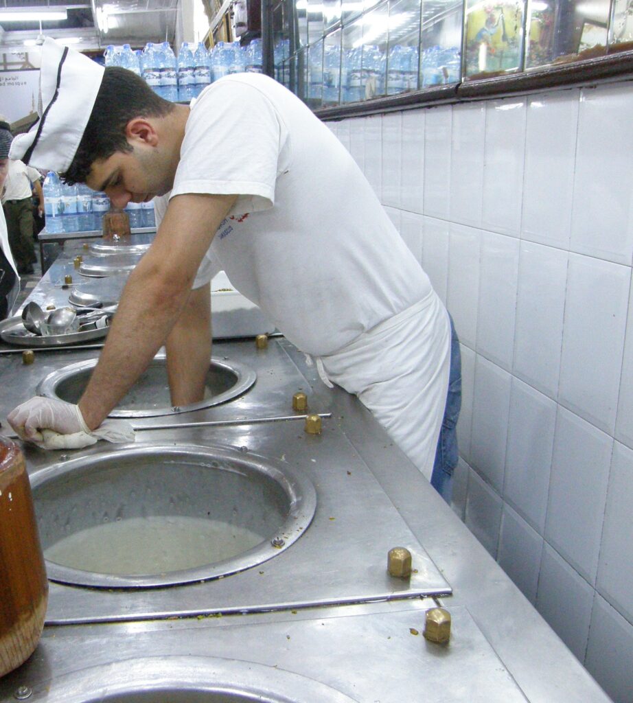 Das Eis stampft man mit einem mächtigen Holzknüppel aus Milch, Zucker, Rosenwasser und frischen Früchten. Im Unterschied zu dem Eis, das wir in Europa herstellen, ist es in seiner Konsistenz zäher und klebriger. Zum Schluss streut man noch gehackte Pistazien darüber.