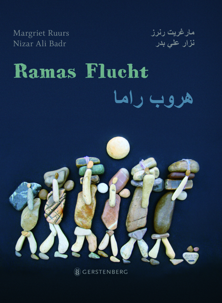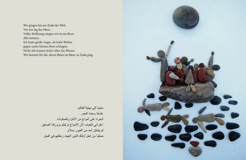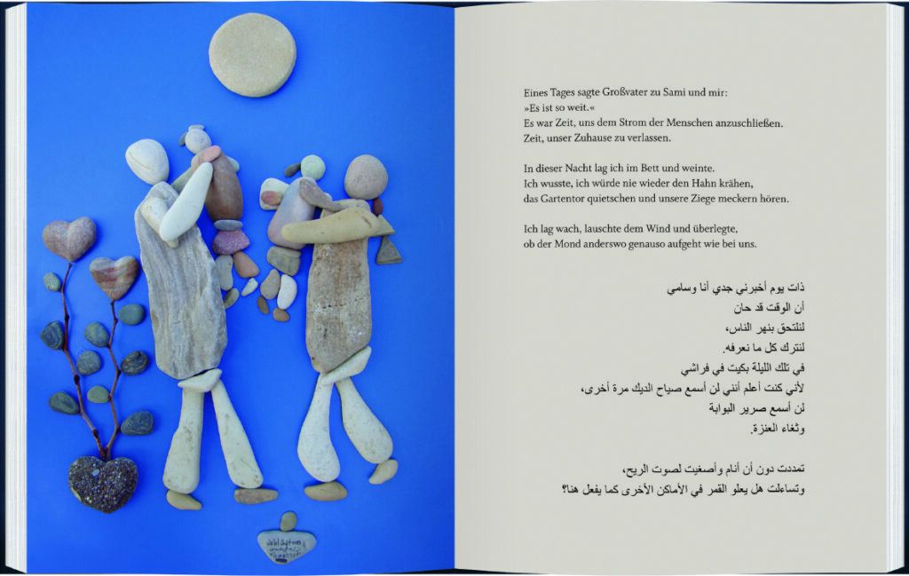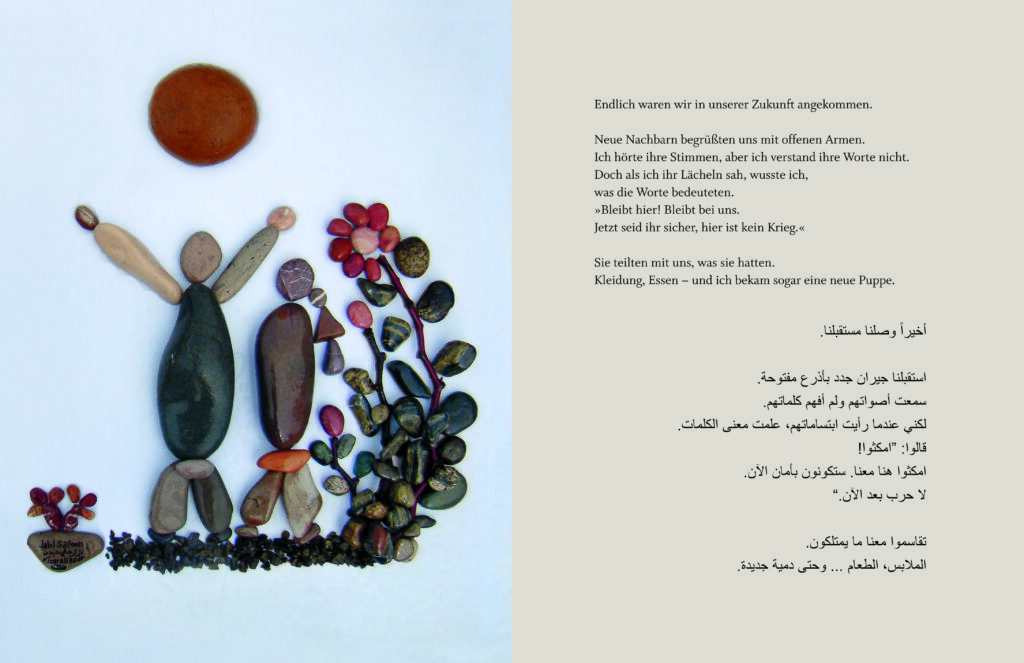 Die poetische Ich-Erzählung, aufgeschrieben von Margriet Ruurs, lässt uns teilhaben an den Erfahrungen eines Kindes mit seiner Familie auf der Flucht aus der Heimat. Die Worte - deutsch und arabisch - führen entlang an Bildszenen, die der syrische Bildhauer Nizar Ali Badr in Lattakia/Syrien auf dem Dach seines Hauses aus gesammelten Steinen gelegt hat. Die Bilder existieren dabei nur für das Foto, um anschließend etwas Neues entstehen zu lassen.