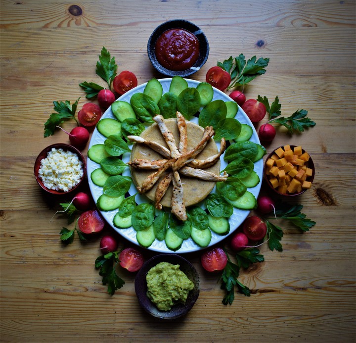 ein Maistortilla nehmen und mit leckeren Zutaten füllen, beispielsweise: Hähnchenstreifen, Mangostückchen, Frühlingszwiebeln, Tomatenwürfeln, Eisbergsalat, Gouda-Käse...
