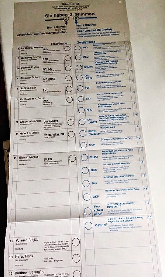 Am Wahlsonntag kann jeder Wahlberechtigte zwei Kreuze auf seinem Wahlzettel machen, das heisst zwei Stimmen abgeben. Mit dem Kreuz in der ersten (linken) Rubrik –die Erststimme - entscheidet er sich für einen Kandidaten seines Wahlbezirks. Dieser Kandidat kann einer Partei angehören oder parteilos sein. Die Kandidaten treten im Wahlkreis gegeneinander an.