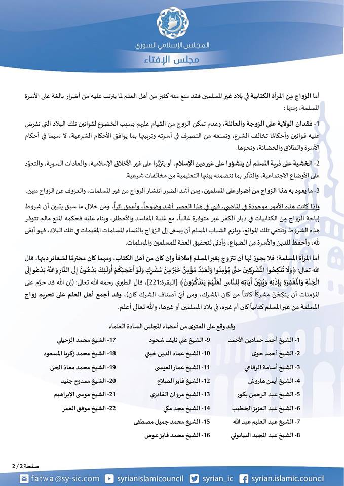 Zurück zum Syrischen Islamrat: Viele syrische Imame, die in Istanbul leben, haben diesen im Mai 2014 gegründet. Diese Imame sind gegen die Assad Regierung und sie sagen, sie beten für die Freiheit. Die Fatwa, die jetzt veröffentlicht wurde, ist für muslimische Männer, die nicht in muslimischen Ländern leben. Damit meinen sie europäische Länder. Den Männern wird gesagt, sie sollen keine nicht-muslimische Frauen heiraten, sondern nur gläubige, muslimische Frauen.