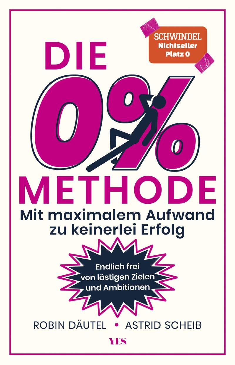 „Die 0%-Methode“ von Astrid Scheib und Robin Däutel nimmt auf humorvolle Weise den Trend zur Selbstoptimierung aufs Korn. Das fiktive Autorinnenduo feiert das Nichtstun als legitime Lebensweise und lädt Leserinnen ein, sich von gesellschaftlichen Zwängen wie Produktivität und Perfektionismus zu befreien. Mit ironischen Ratschlägen und überzeichneten Lebensgeschichten präsentieren sie das Scheitern als Erfolgsrezept und schaffen es, die Absurdität unserer Leistungsorientierung auf urkomische Weise zu entlarven – ein befreiendes Lesevergnügen für alle, die sich der Optimierungsfalle entziehen wollen.